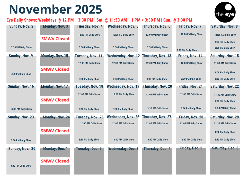 Stay for a show at The Eye Planetarium, open Tuesday through Sunday. During the month of November, the Eye offers two public daily shows Tuesday through Friday at 12:00 PM and 3:30 PM, three daily shows on Saturday at 11:30 AM, 1:00 PM, and 3:30 PM, and one show on Sunday at 3:30 PM, with the exception of closures and special events.*